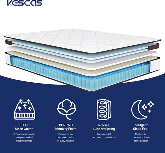 Kescas 4FT6 Double Mattress, 10 Inch Pocket Spring Hybrid Mattress with Breathable Foam (ONLY For UK)